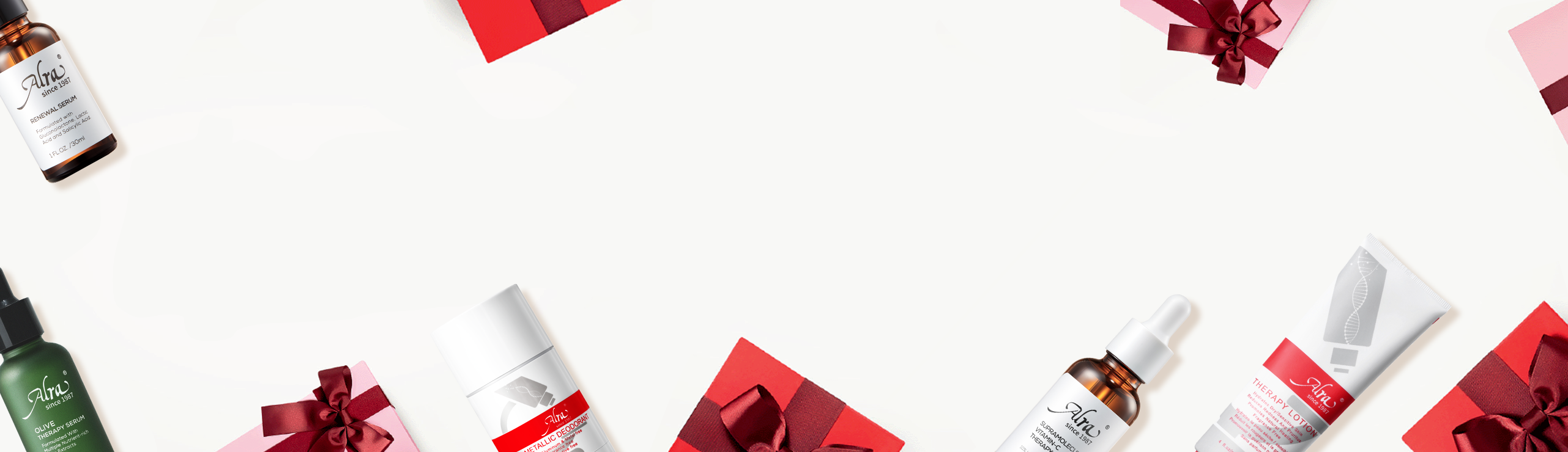 Alra’s 4-piece serum routine for complete skincare: Olive Therapy for acne, Supramolecular Vitamin C for dullness, Renewal Serum for wrinkles, and Tone Correcting Serum for dark spots.