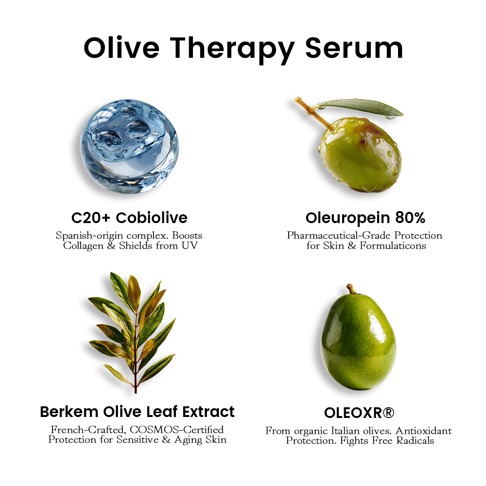 - Olive Therapy Serum calms inflammation, strengthens the skin barrier, and provides strong antioxidant defense.