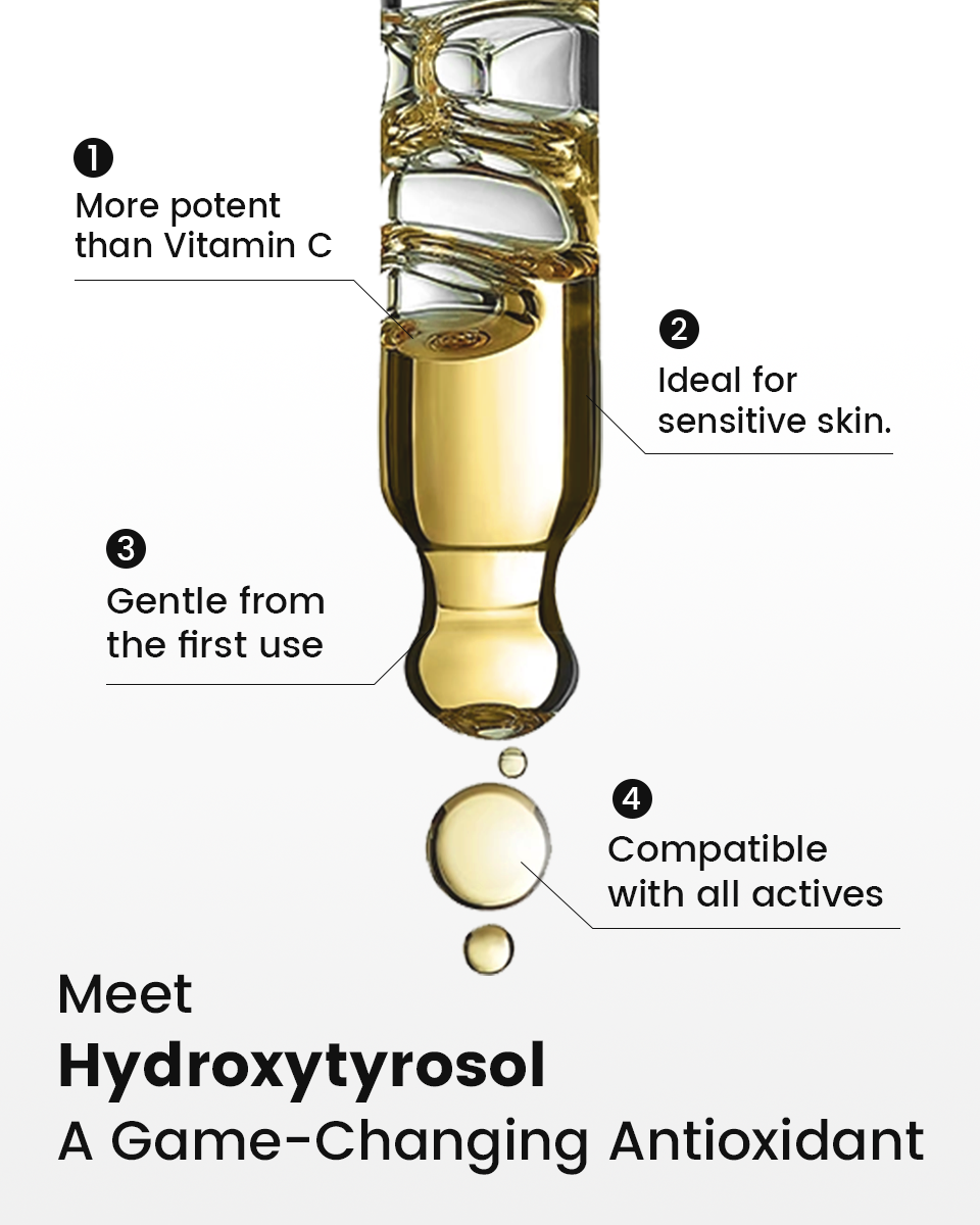 Scientific studies have shown that hydroxytyrosol can have 10–20 times stronger antioxidant activity than Vitamin C in laboratory tests. This means it’s highly effective at neutralizing free radicals that cause premature aging and skin damage.