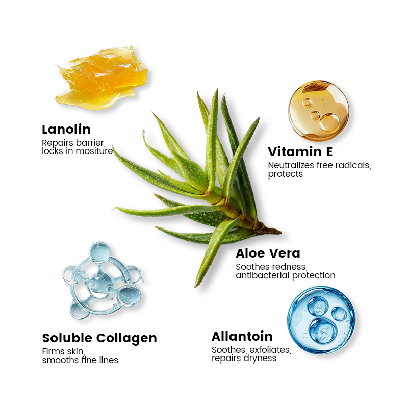WATER, ALOE BARBADENSIS LEAF JUICE, PEG-100 STEARATE, GLYCERYL STEARATE, ISOPROPYL LANOLATE, SOLUBLE COLLAGEN, STEARIC ACID, LANOLIN OIL, ACETYLATED LANOLIN, METHYLPROPANEDIOL, CAPRYLYL GLYCOL, PHENYLPROPANOL, CETYL ALCOHOL, TOCOPHERYL ACETATE, STEARYL ALCOHOL, TRIETHANOLAMINE, POTASSIUM SORBATE, ALLANTOIN, TETRASODIUM EDTA